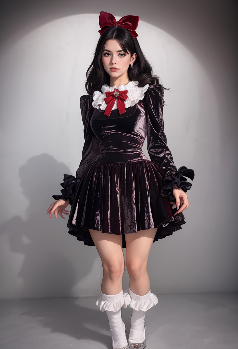 dr3ss, dress, crushed velvet, skirt, bow, ribbon, chest jewel, long sleeves