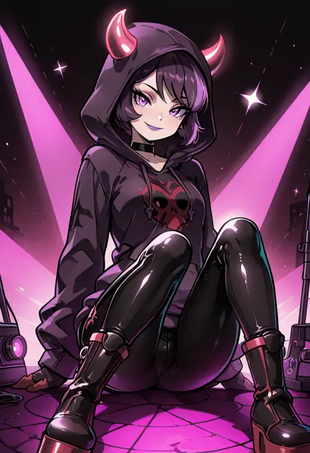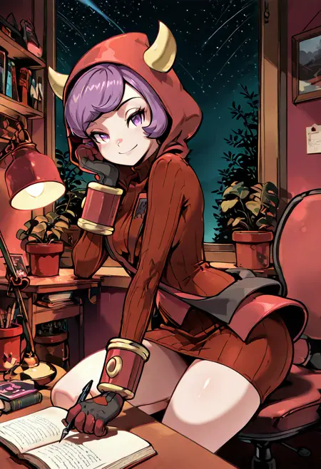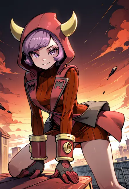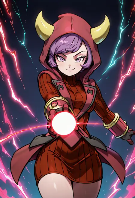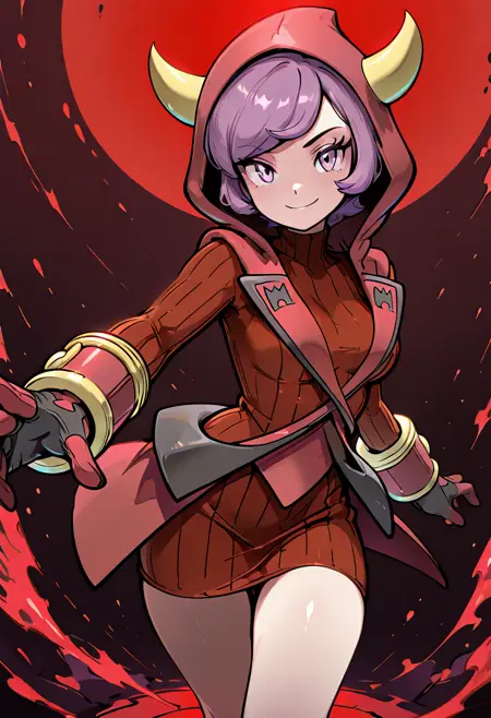 hoodie, red dress, red gloves, fake horns, sweater dress, ribbed dress, turtleneck dress,