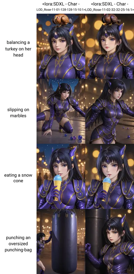 Testing more methods of LoRA training. Made a smaller LoRA to see how it compares to a 128 dimension. This one is a 32/32. When I made 128 dim versions it seemed to create her clothes better/more accurate, but I wanted to see if I could get her accurate with a smaller file size.