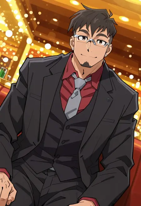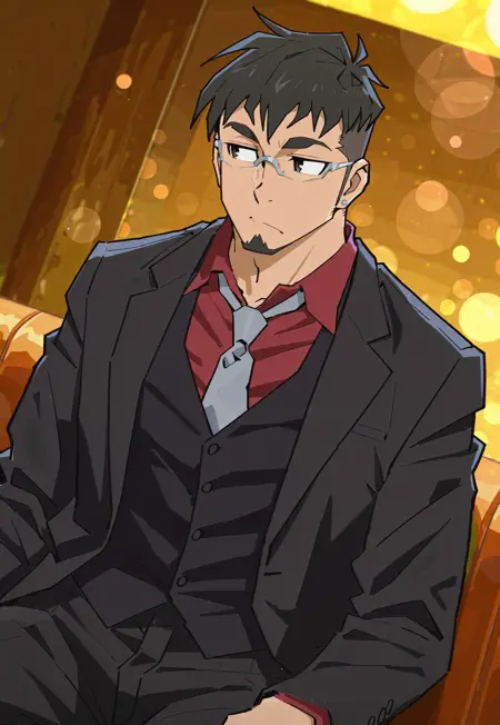 GPJay_outfit01, 银框眼镜, 三件套西装, 红色领衬衫, 灰色领带, 黑色背心, 黑色夹克, 黑色长裤, 黑色鞋子,
