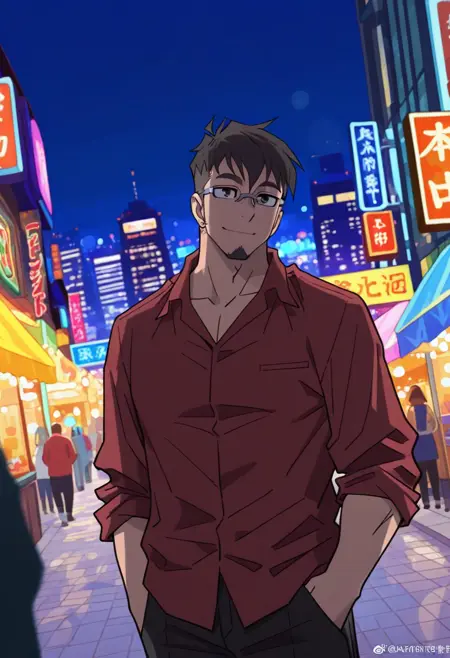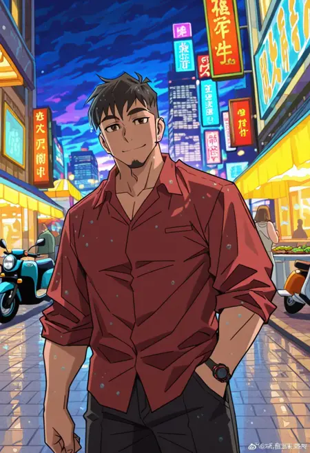 GPJay_outfit04, 红色领衬衫, 衬衫未塞进裤子, 袖子卷起, 黑色长裤, 黑色鞋子