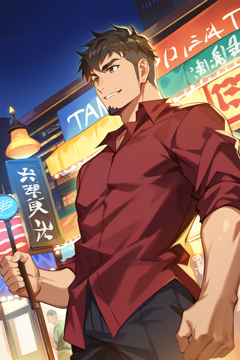 GPJay_outfit03, red collared shirt, shirt tucked in, sleeves rolled up, black pants, black shoes