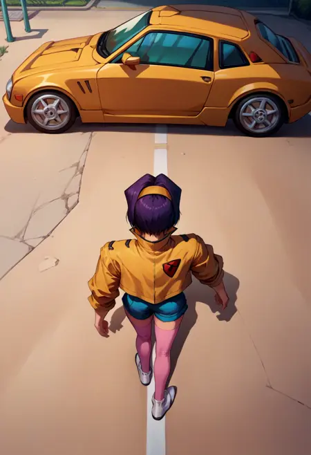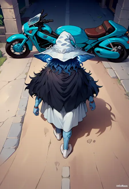 Trigger + Additional Tags: akiraposter, from above, from behind, walking, ground vehicle, motorcycle