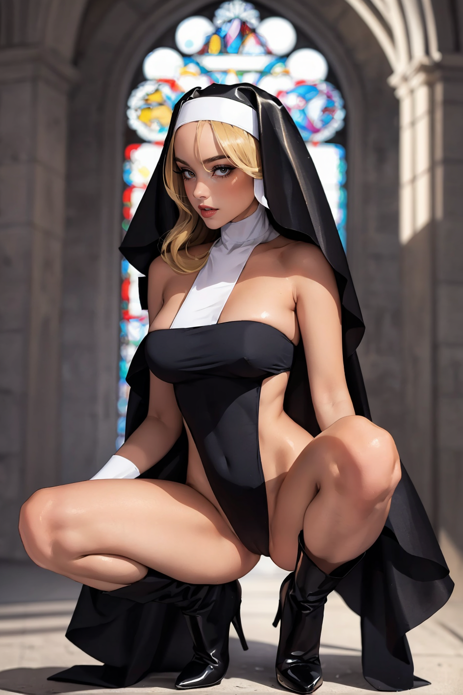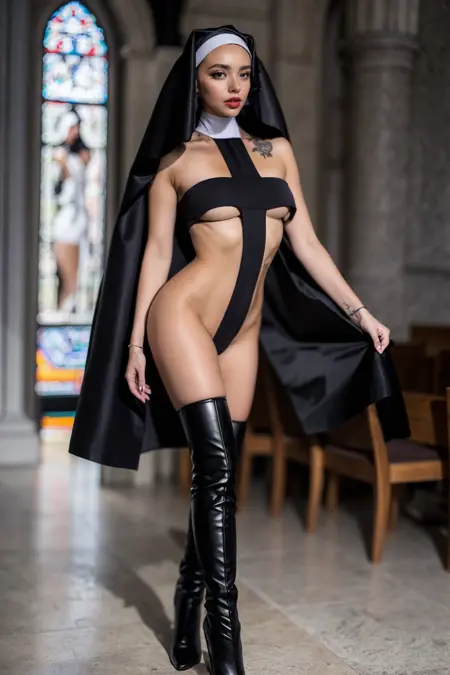 关键词:nun_1,黑色十字形肩部镂空紧身衣,侧边镂空,修女服,高跟靴