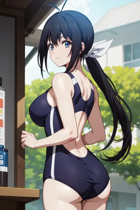 Nozomi, black hair, ((low ponytail), very long hair:1.2), antenna hair, blue eyes, white ribbon