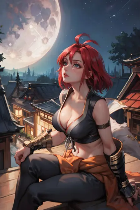 为体现她典型的造型,请添加 "black crop top, sleeveless, cleavage, gauntlets, black pants, clothes around waist, white overskirt"。