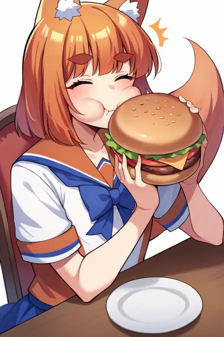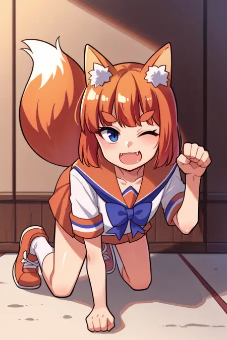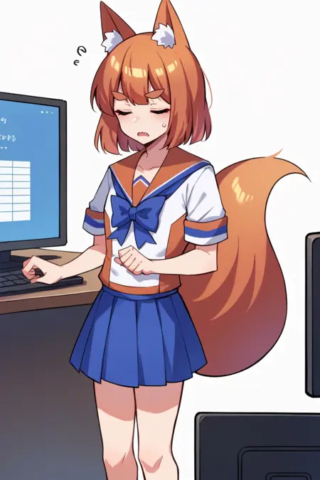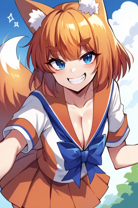为呈现她的典型造型,请添加 "蓝色蝴蝶结、白色衬衫、水手服、短袖、蓝色裙子、狐狸尾巴"。