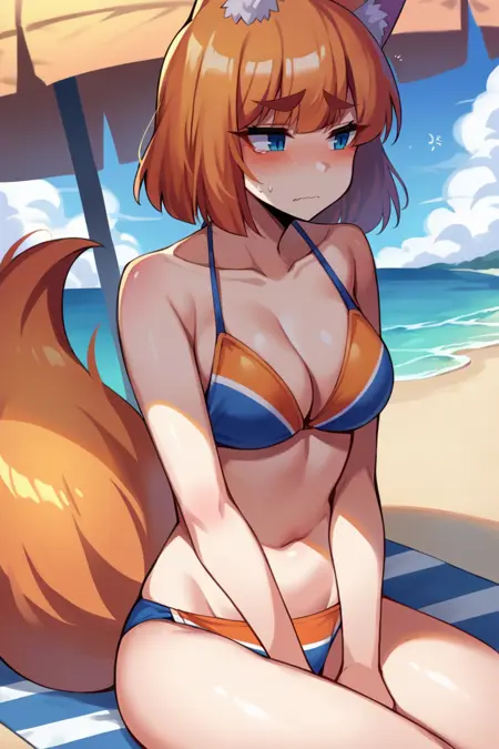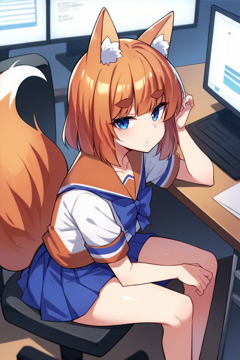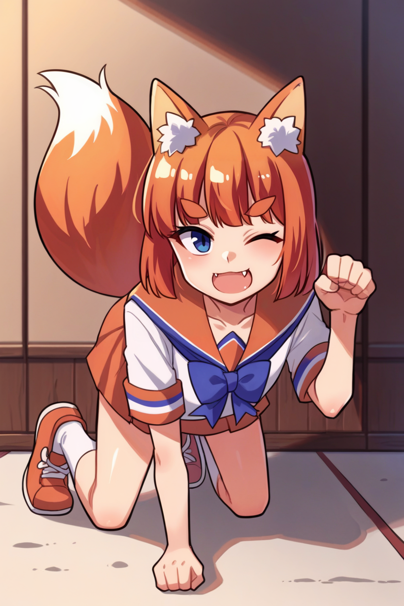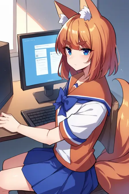 Add "blue bowtie, white shirt, serafuku, short sleeves, blue skirt, fox tail" for her typical look.