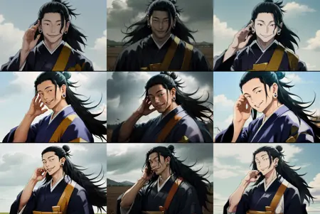 TETA 예시: "[token], 주변에 고양이들이 있는 의자에 앉아 있는 녹색과 보라색 복장을 입은 남성, 1boy, 앉아있음, 언더컷, 남성 중심, 갑옷, 수염, 흉터, 얼굴 흉터, 눈 가로 흉터"