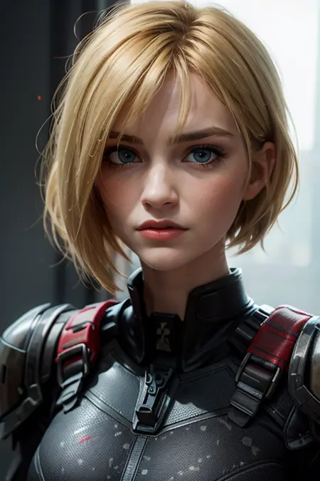 提示:一张精美而复杂的全彩超高清肖像,女孩,左侧短金色金发刘海,蓝色眼睛,面部细节丰富,身穿紧身黑色与红色盔甲,史诗级角色构图,Alessio Albi,Nina Masic,锐利对焦,自然光线,皮下散射,f2,35mm,