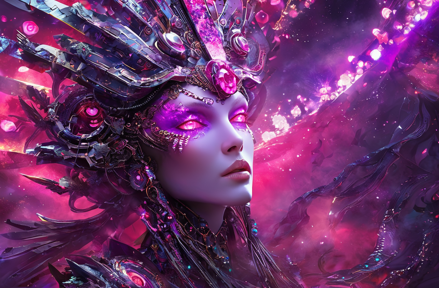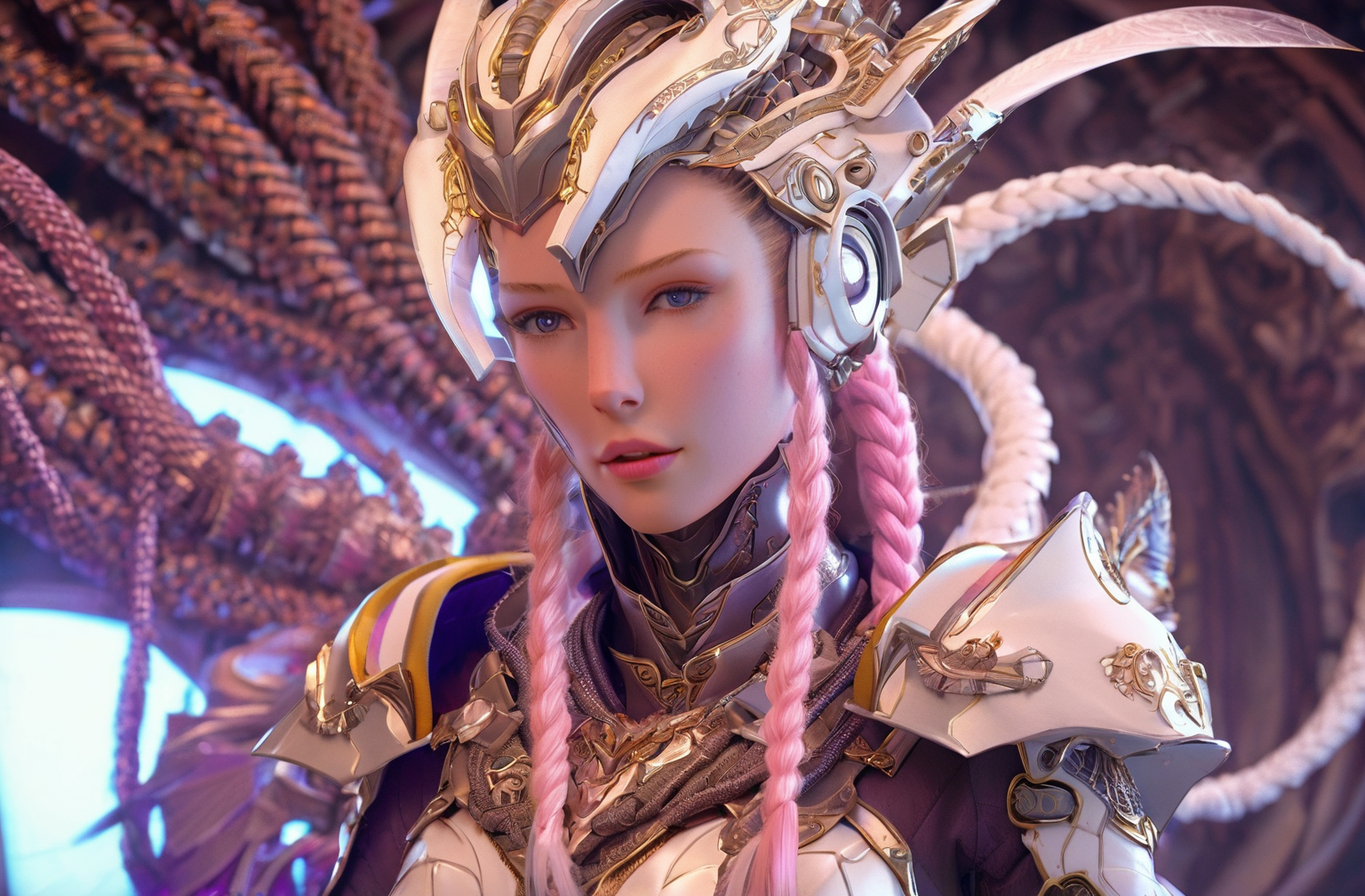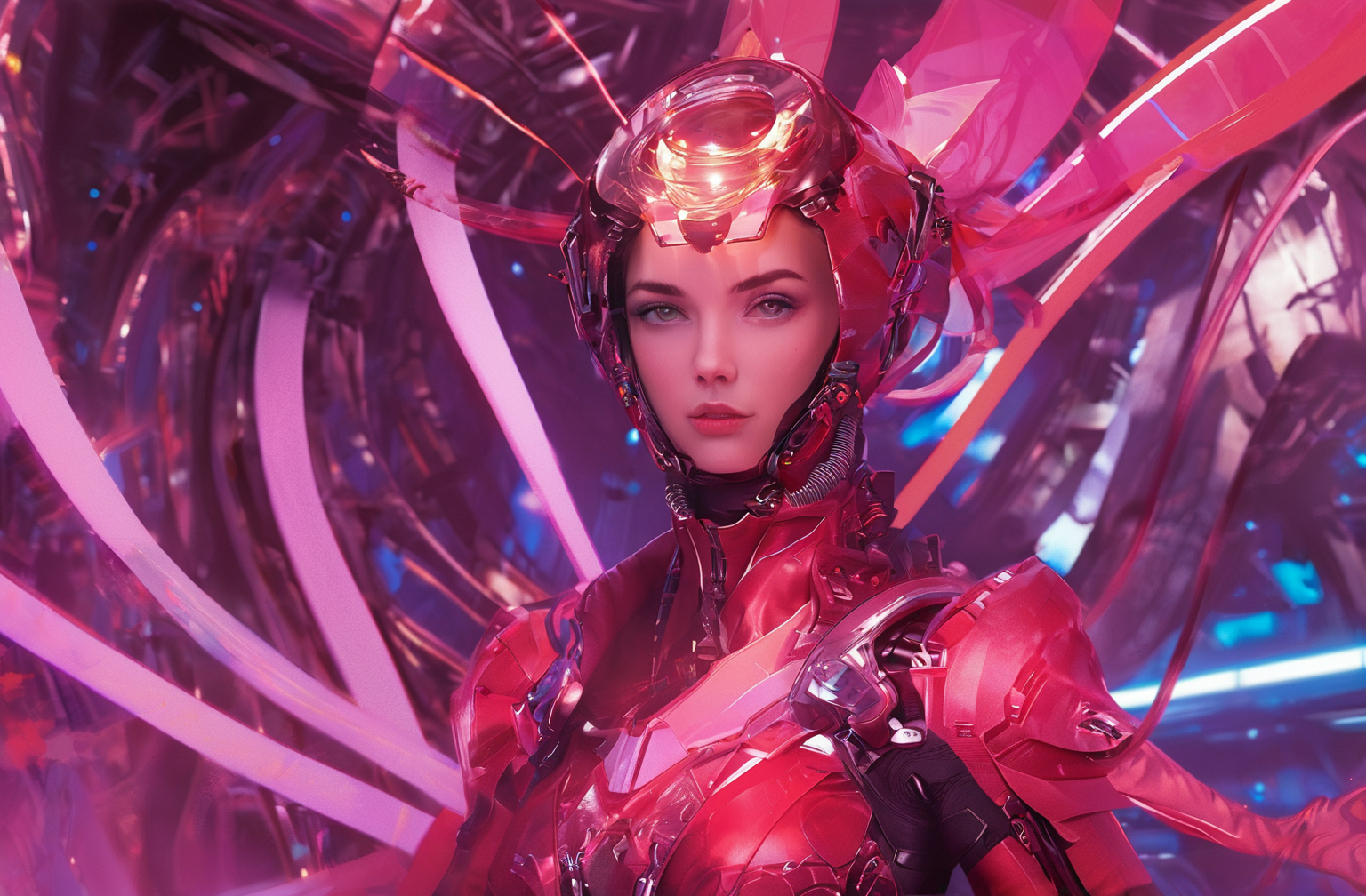 Positive prompt words: FN Concept, Concept map, film and television special effects concept, cyber technology, ultra high definition face, describe this image in a very detailed manner. a woman with a contemplative gaze is depicted in a futuristic white suit, her The face adorned with a transparent visor and a pink neon lighting effect that highlights her freckles and the delicate texture of her skin. the suit's sleek design and the neon's vibrant hue create a stark contrast, emphasizing the woman's serene yet intense expression. (note the prompt word You can imagine by yourself)