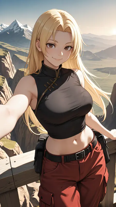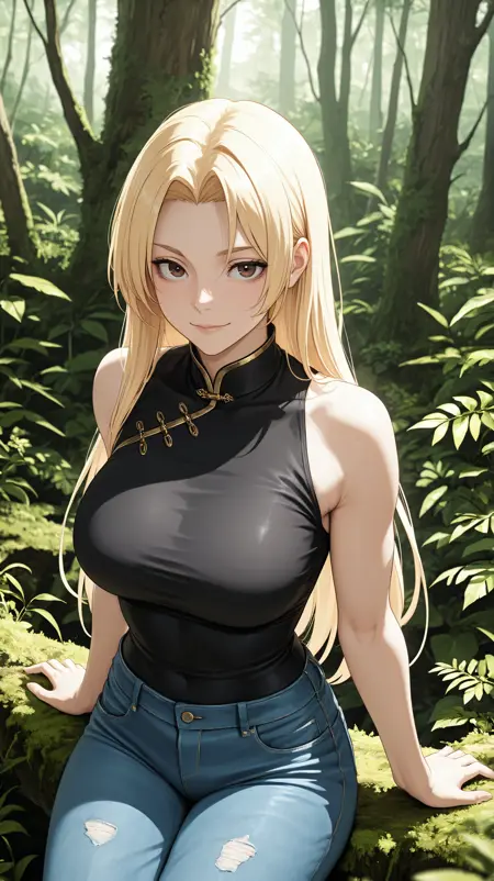 long hair, blonde hair, brown eyes, black top, turtleneck, sleeveless, jeans