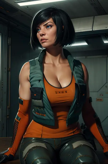 elbow gloves, or black elbow gloves, green vest, or vest, orange shirt, or shirt, pants, belt,