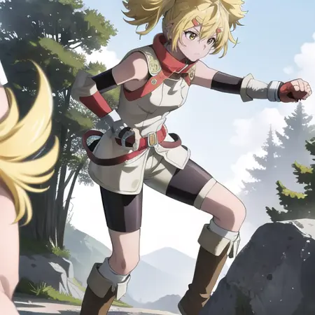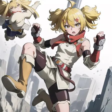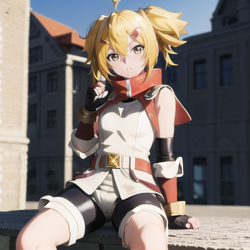 2. I forgot the activation tag so just doing these should work either way; it did for me: "1girl, solo, twin tails, blond hair, hair in between eyes, boots, gloves, gauntlets, gold eyes, hair ornament, ahoge, fingerless gloves, white sleeveless jacket, elbow gloves, bike shorts,"