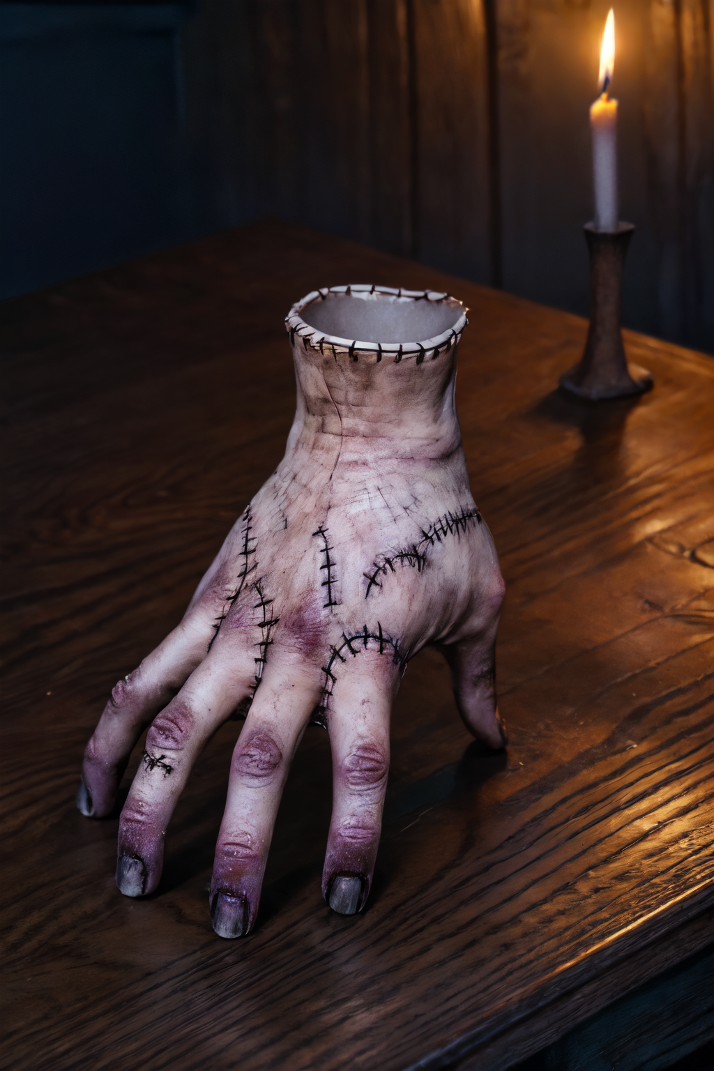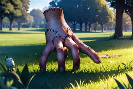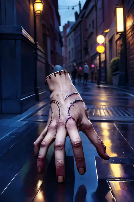 Trigger : severed hand, black nails, stitches, fingers, thing (addams family), standing