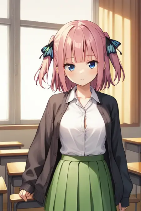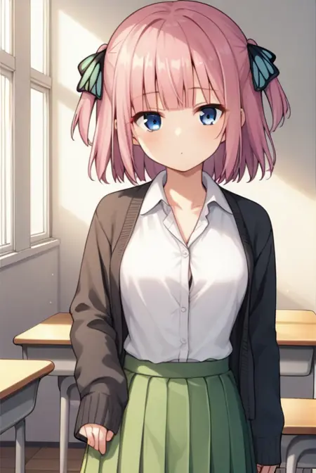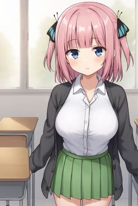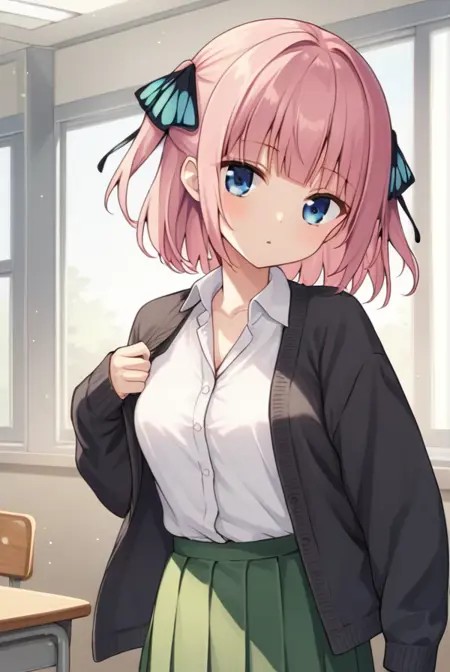 nino nakano,短发,刘海,蓝眼睛,发饰,发带,粉发,齐刘海,两侧上梳,蝴蝶发饰,