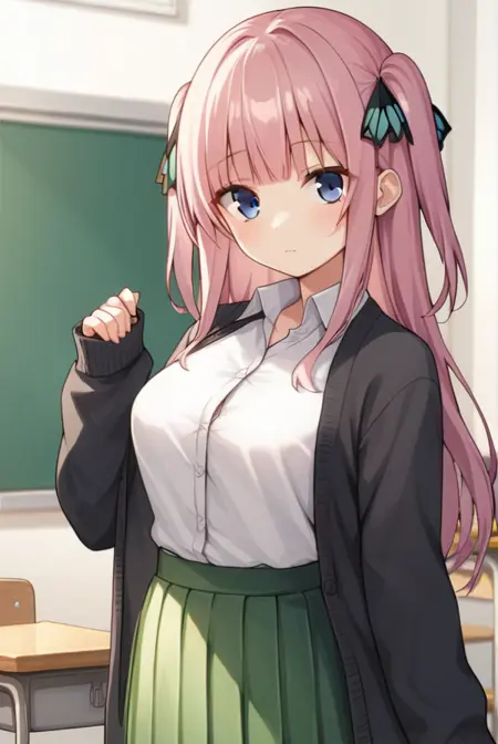 nino nakano,长发,刘海,蓝眼睛,发饰,发带,粉发,齐刘海,两侧上梳,蝴蝶发饰,