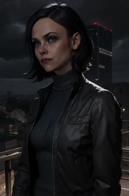 helen, blue eyes, or grey eyes, black hair, medium hair,