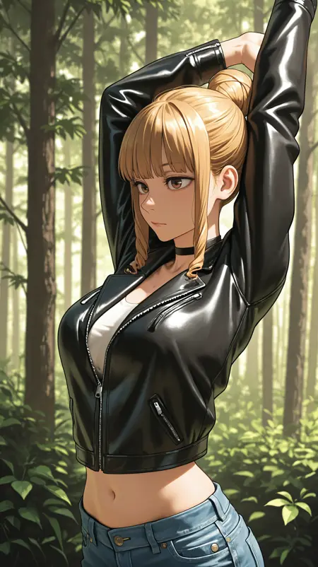 blonde brown hair, single hair bun, brown eyes, yellow cardigan, blue pleated skirt
