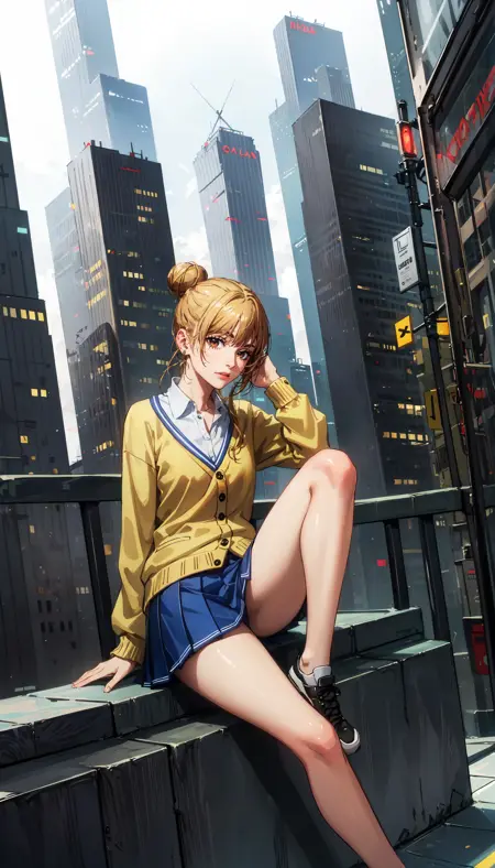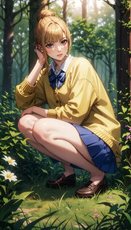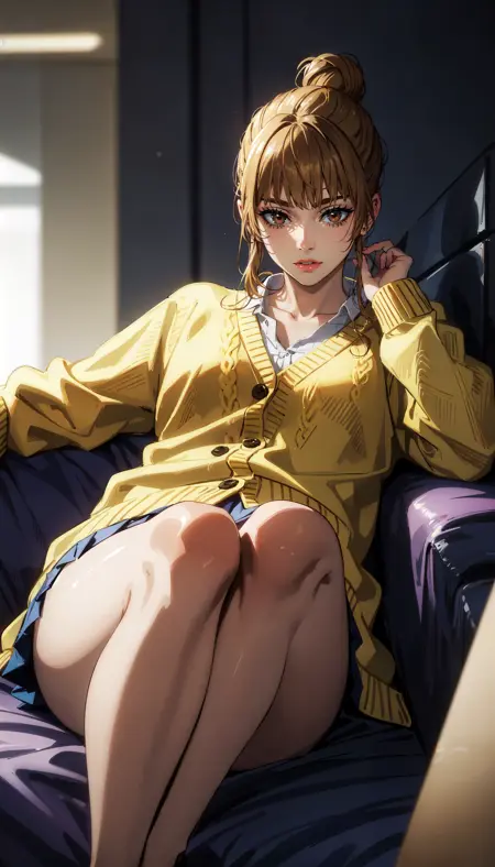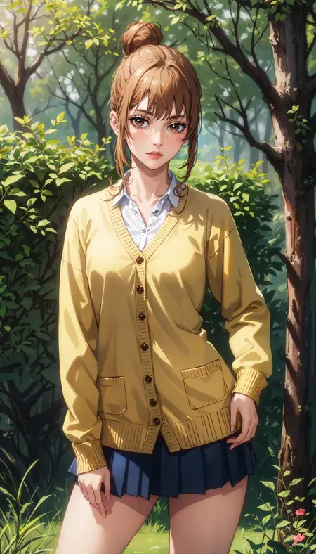 blonde brown hair, single hair bun, brown eyes, yellow cardigan, blue pleated skirt