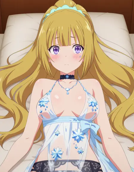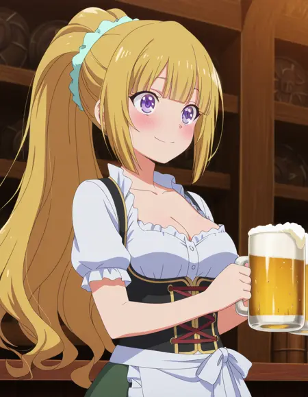 けい・軽井沢、長い髪、前髪、まっすぐな前髪、紫色の目、金髪、シャツ、髪飾り、ポニーテール、スンチー、青いスンチー、笑顔、