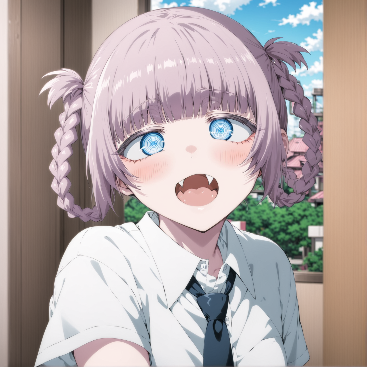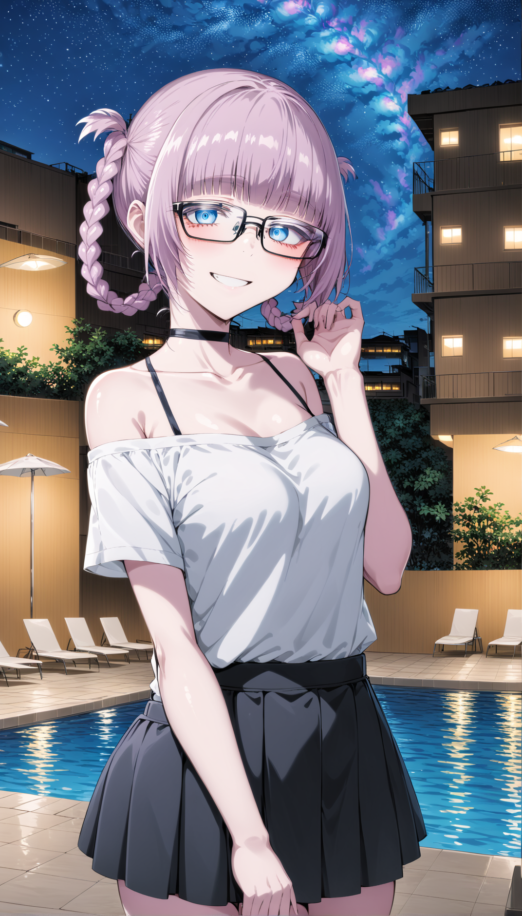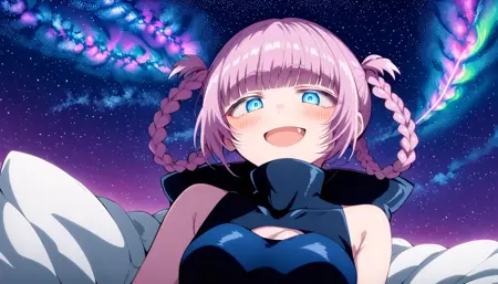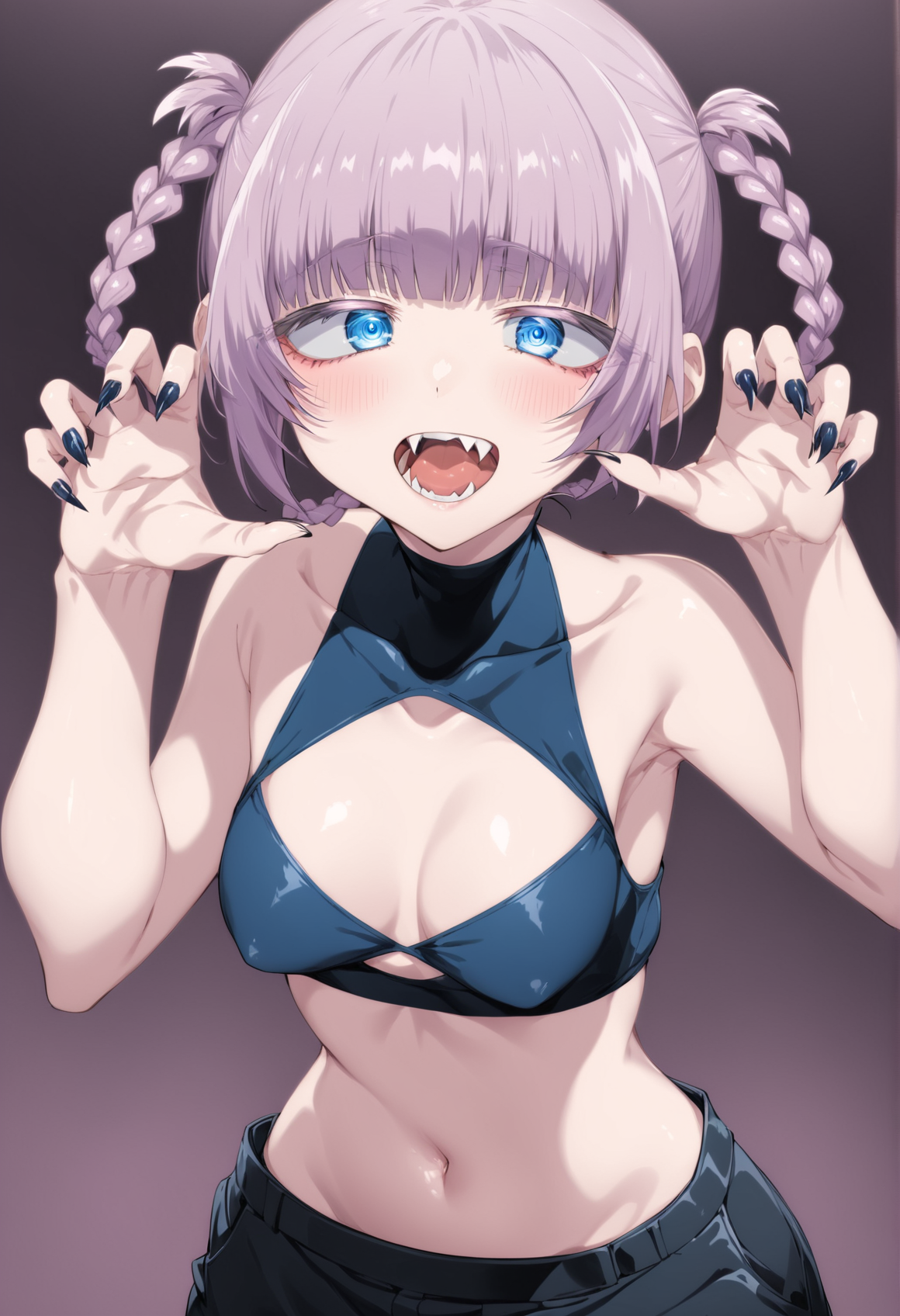 pink_hair, short_hair, blue_eyes, ringed_eyes, twin_braids, small_breasts, black_nails