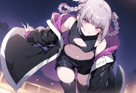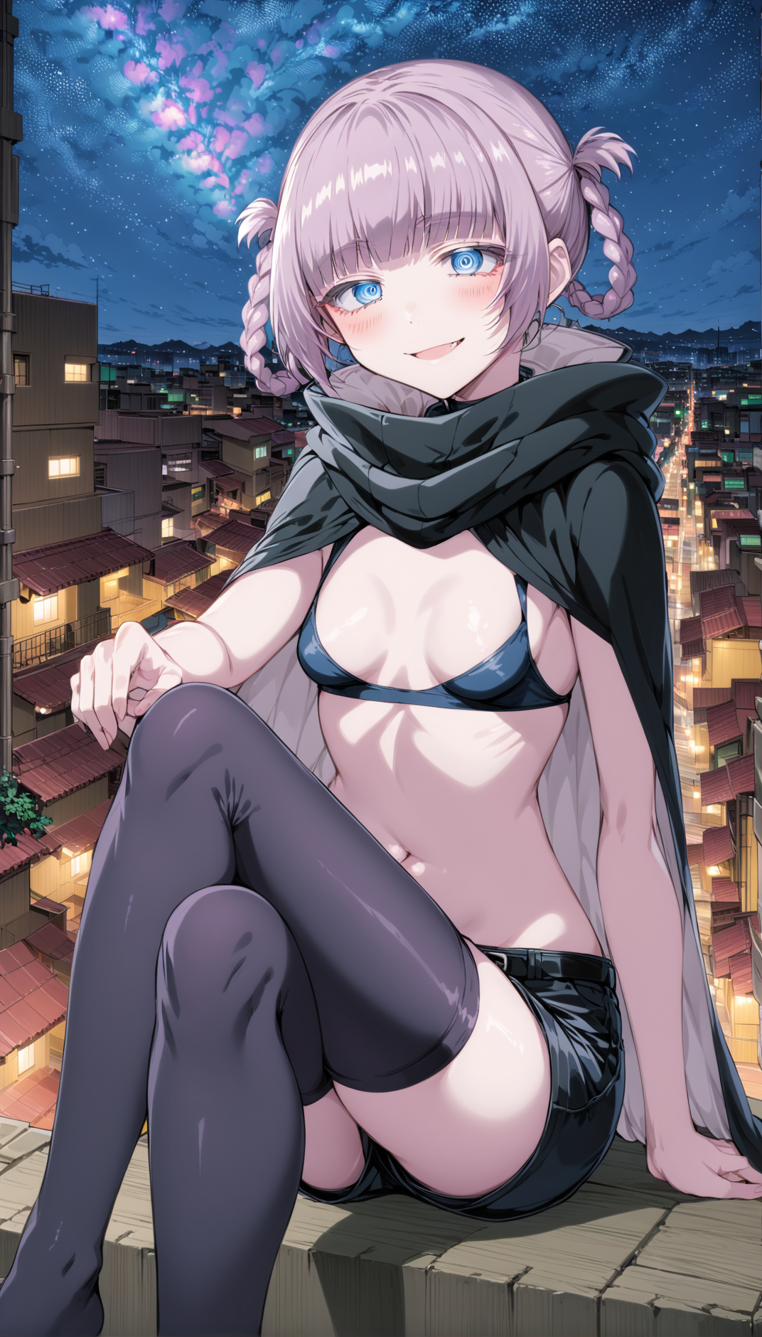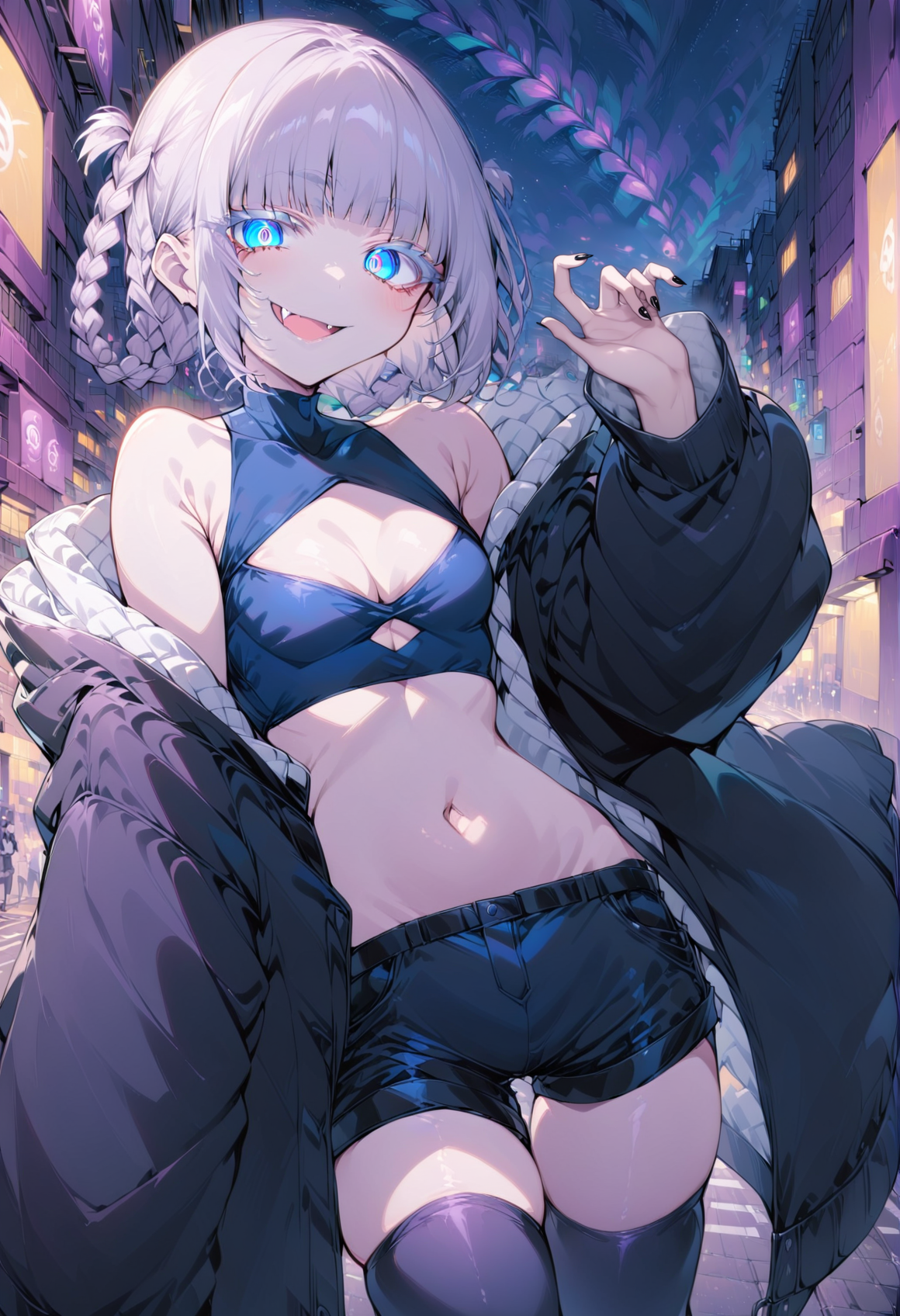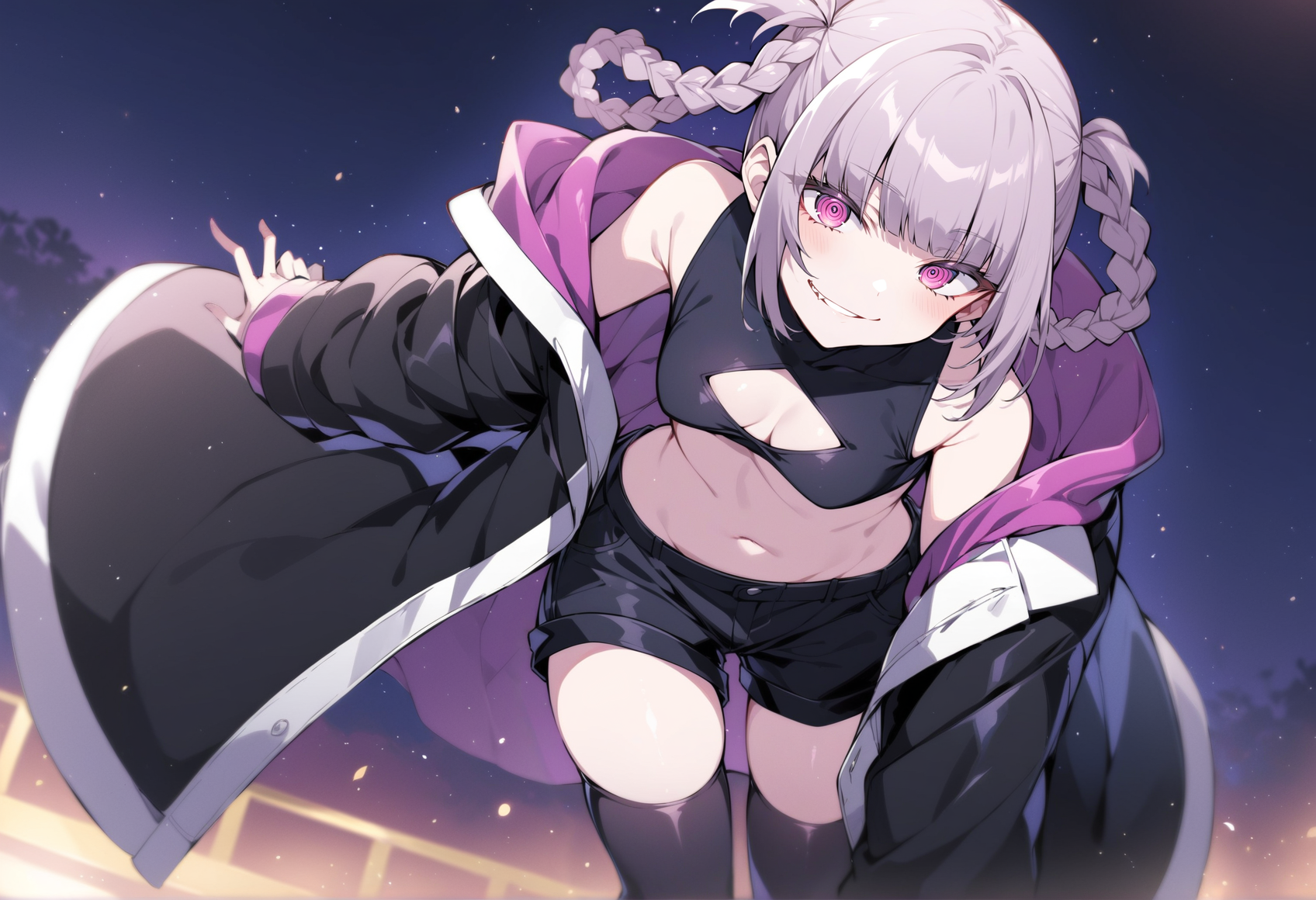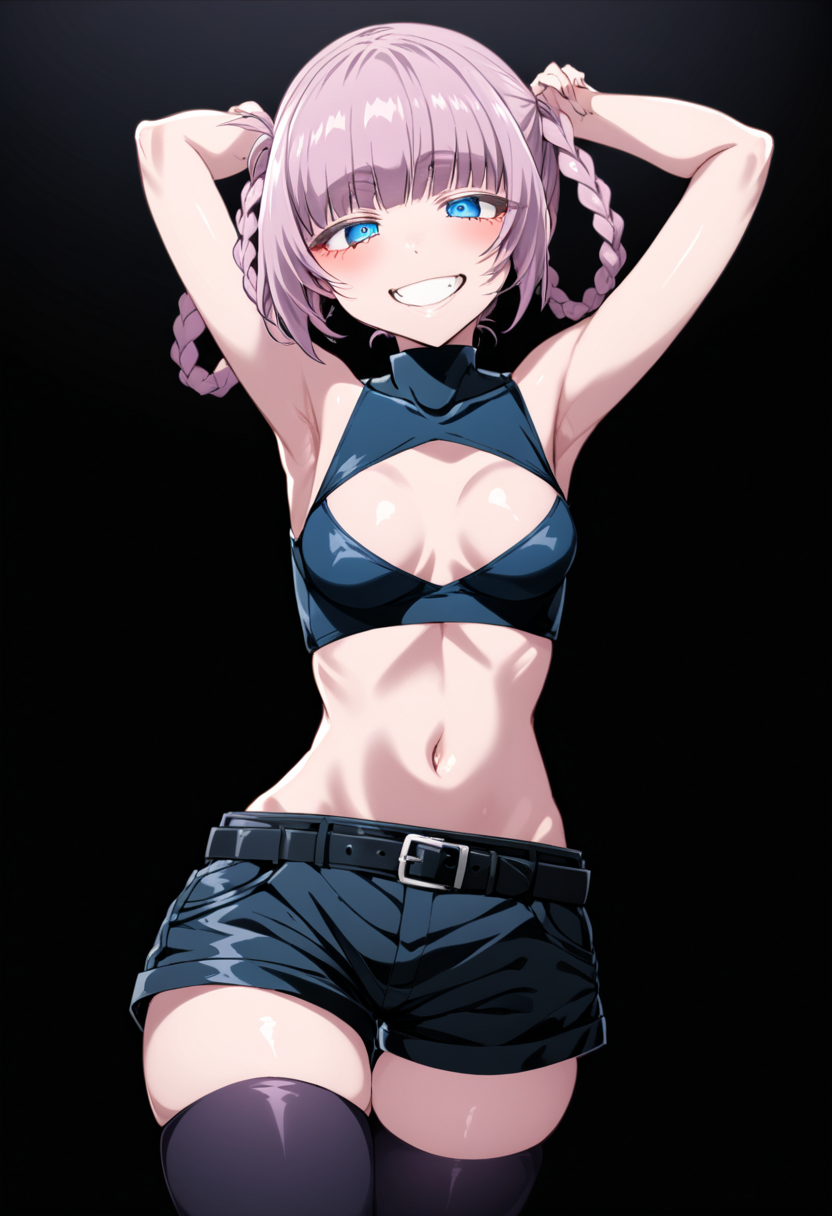 pink_hair, short_hair, blue_eyes, ringed_eyes, twin_braids, small_breasts, black_shorts, clothing_cutout, bare_shoulders, crop_top, black_thighhighs, black_nails