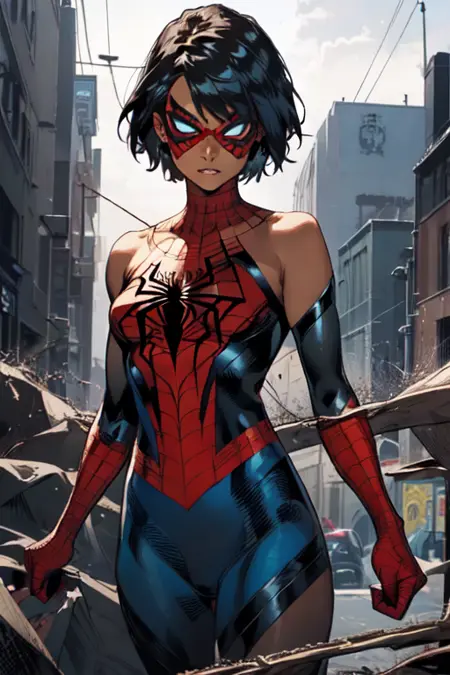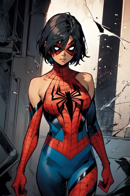 SpiderBick, 1girl, solo, short hair, medium breasts, black hair, dark skin, dark-skinned female, gloves, bodysuit, bare shoulders, detached sleeves, mask, superhero, spider web print