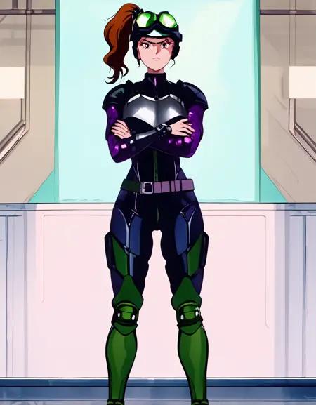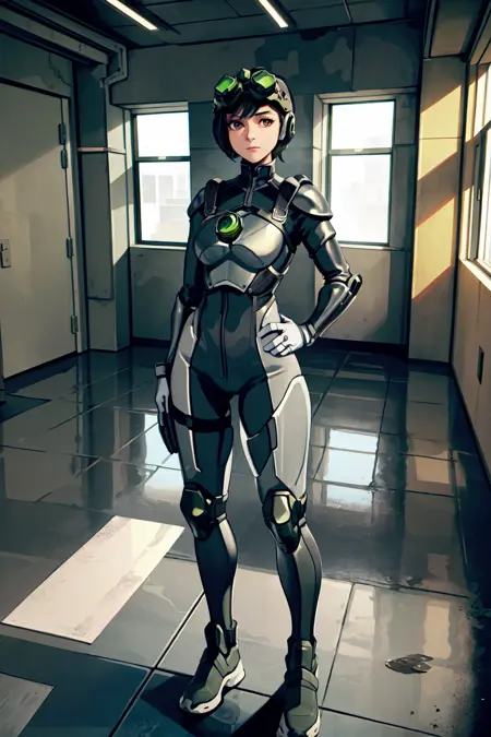 For her Elite Squad/secret agent in her father's footsteps outfit, "bodysuit,armor,goggles, helmet."