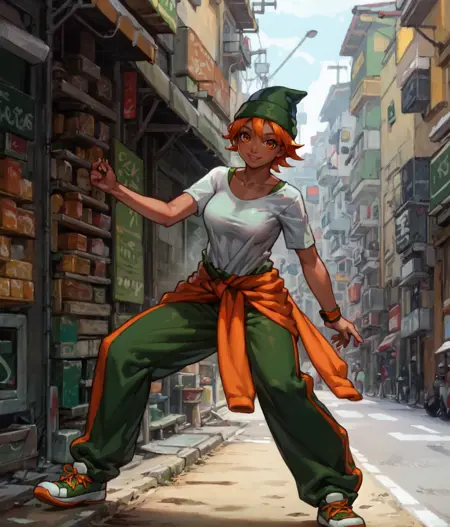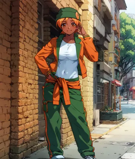 注目タグ:黒い肌、オレンジ色の髪、短い髪、オレンジ色の目、白いシャツ、編み上げの緑の帽子、たるんだ緑のズボン、腰にジャケット、スニーカー