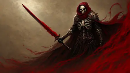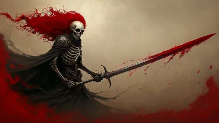- AssassinKahb style a demonic looking skeleton holding a sword with red hair