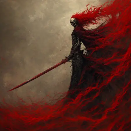 - AssassinKahb style a demonic looking skeleton holding a sword with red hair
