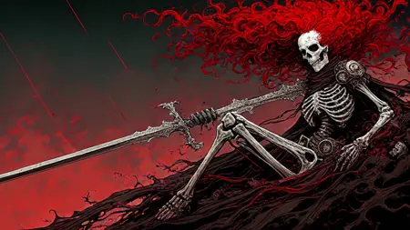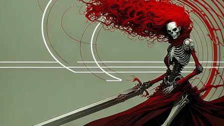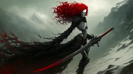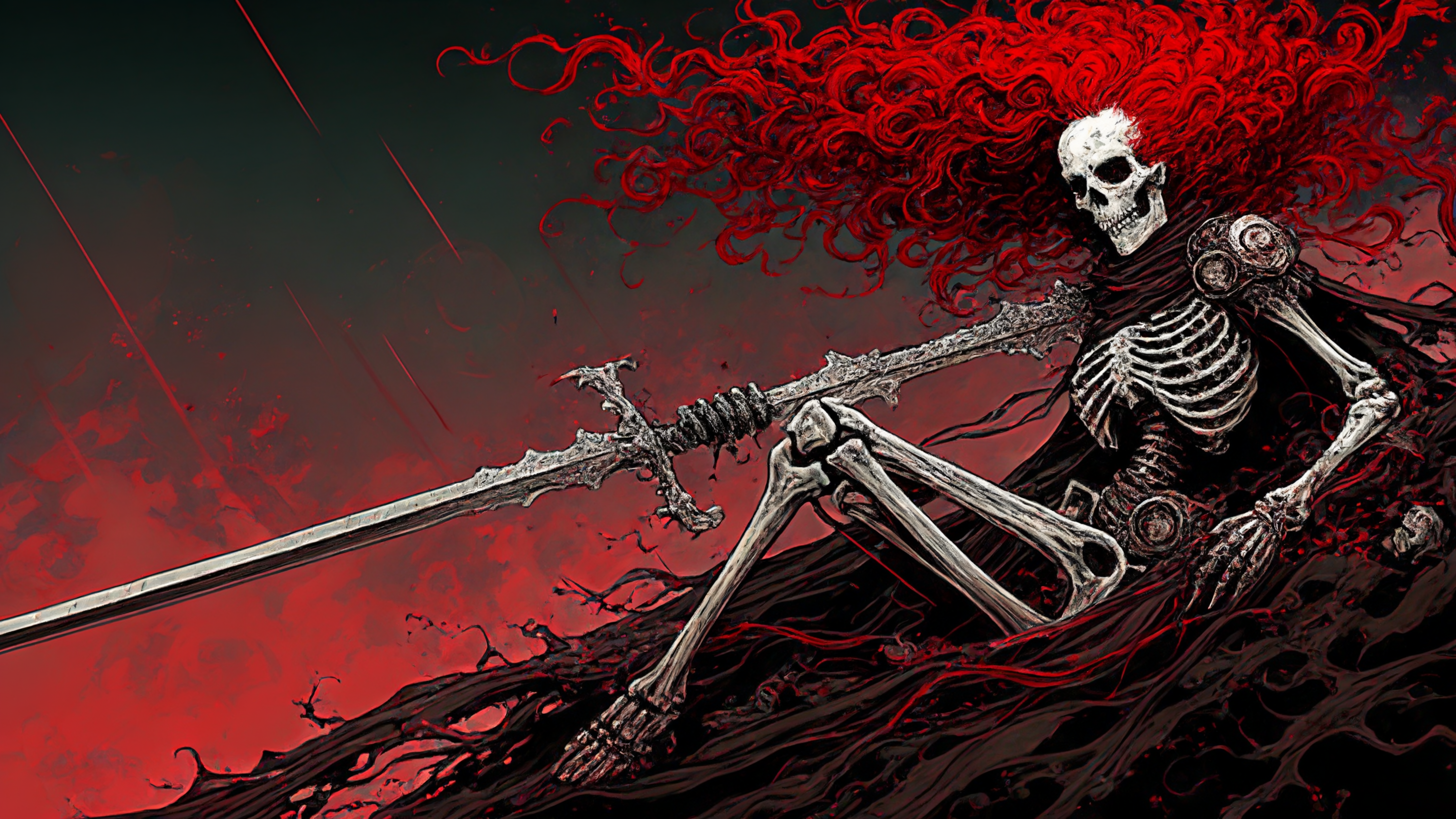 - AssassinKahb style a demonic looking skeleton holding a sword with red hair