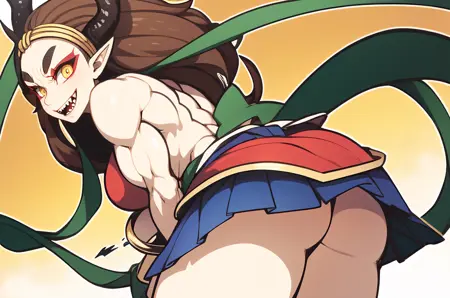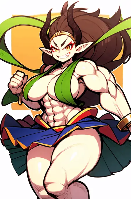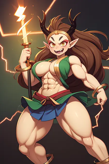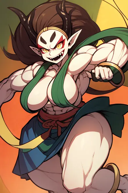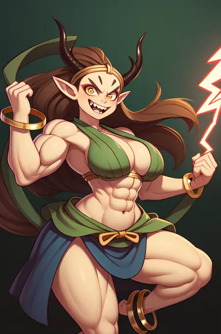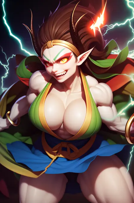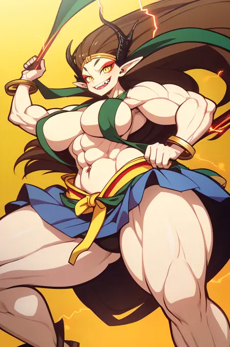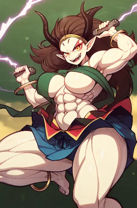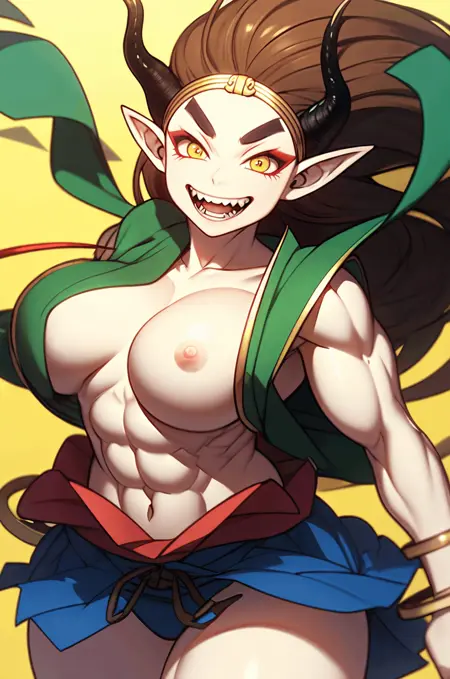 Raijin, hikimayu, colored skin, white skin, brown hair, long hair, muscular female, obliques, abs, horns, yellow sclera, red eyes, pointy ears, long hair, green hagoromo, large breasts, topless, gold bracelet, gold anklet, gold circlet, long hair, red eyeshadow, convenient censoring, oni, v-shaped eyebrows, tsurime, grin, fangs, teeth