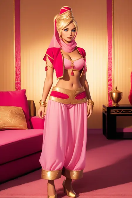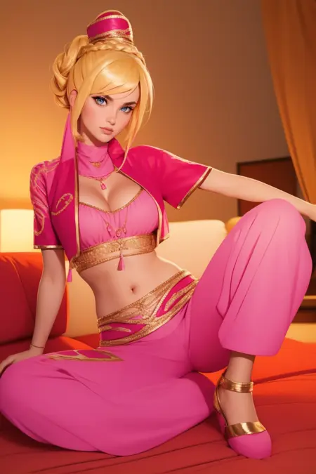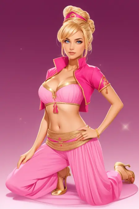 키워드: pink genie giab_1, 크롭 탑 셔츠, 빨간 크롭 자켓, 탄성 cuffs가 있는 투명한 하레ム 바지, 하이힐, 금색 자수, 모자(아라비안 마스크도 추가 가능)