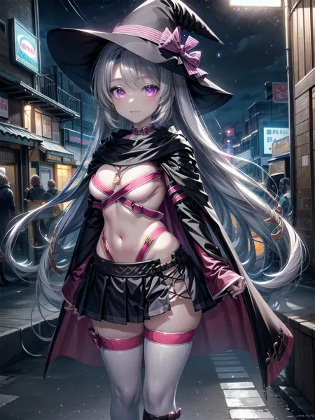 | トレーニングワード | long hair,hat,witch hat,purple eyes,cape,1girl,blush,solo,looking at viewer,skirt,thighhighs,large breasts,ribbon,navel,striped,belt,grey hair,detached sleeves,bow,cleavage,white hair,collar,hat bow,single thighhigh,black skirt,pleated skirt,black headwear,very long hair,miniskirt,beltbra,jewelry,black capehair between eyes,necklace,boots,City Backgroundコピーしました! |
