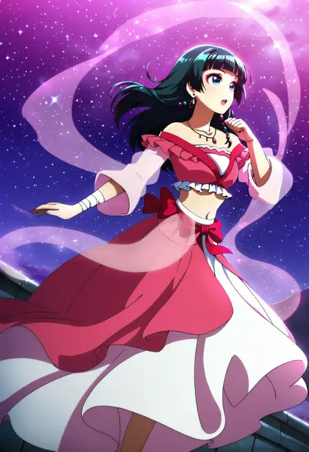 sparkling dress, blue dress, midriff, sparkling footwear, layered dress, long sleeves, wide sleeves, glint, partially bare shouldersstraight hair, hair beads, hair over shoulderearrings, purple earrings, star earrings, jewelrymakeup, lipstick, pink eyelinermakeup, pink eyeliner, freckles
