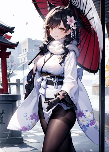 기모노: atago_(azur_lane), 갈색 눈, 긴 머리, 동물 귀, 눈 밑 점, 일본식 복장, 머리 꽃, 주름진 소매, 검은 장갑, 흰 스카프,