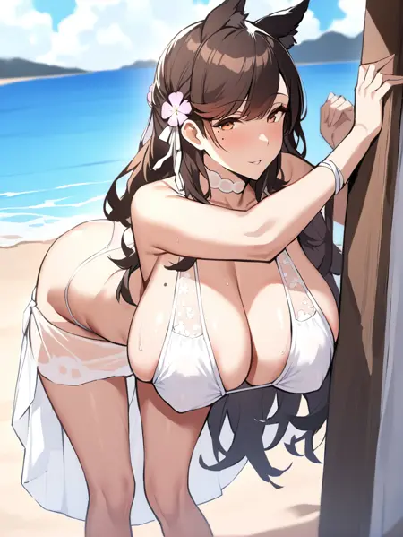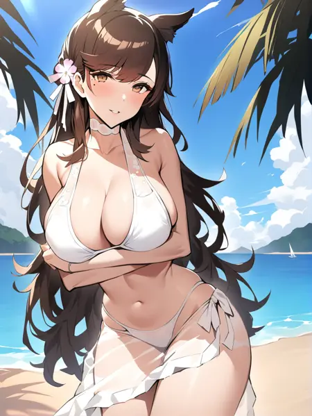 泳装(summer_march):atago_\(azur_lane\),brown_eyes,long hair,animal ears,mole_under_eye,atago_\(summer_march\)_\(azur_lane\), brown eyes,mole_under_eye,collarbone,white_bikini,sarong,