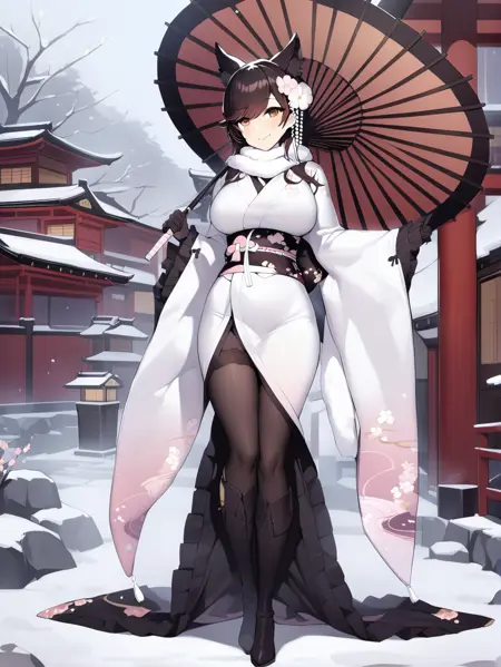 冬季风物诗(hallmarks_of_winter):atago \(hallmarks of winter\) \(azur lane\), kimono, scarf, black gloves,