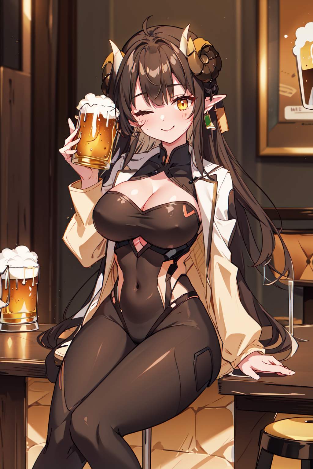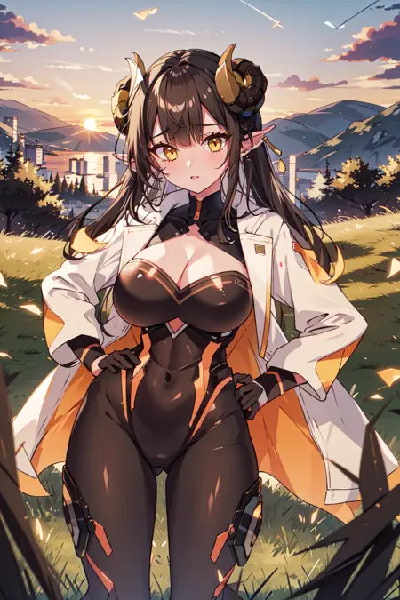 Tags: ccrosselle, cleavage cutout, open coat, bodysuit, earrings, jewelry, sheep horns