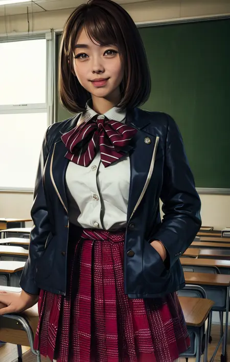 blue jacket, or jacket, striped bow, pleated skirt, or red skirt, or school uniform, --- black socks, shoes, --- black underwear, pantyhose,
