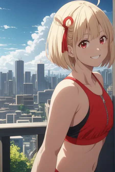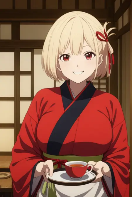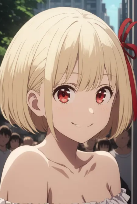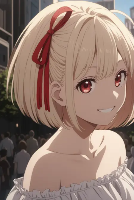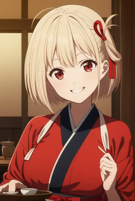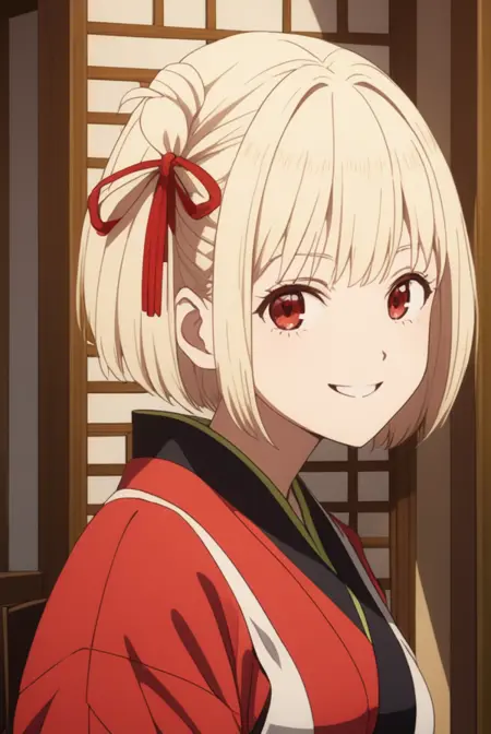 chisato nishikigi, short hair, bangs, blonde hair, red eyes, hair ribbon, one side up, bob cut,