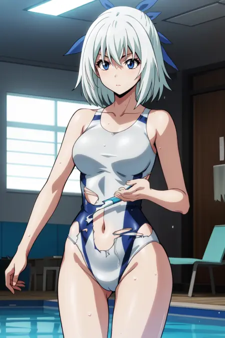 견갑뼈, 흰색 수영복, 흰색 원피스 수영복, 등 허리 절개, 배꼽, (찢어진 옷, 찢어진 수영복:1.3), 맨발