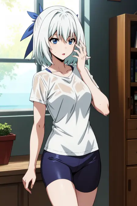 사야카 lora:Sayaka:0.7, 흰색 머리, 단발, 파란 눈, 파란 리본