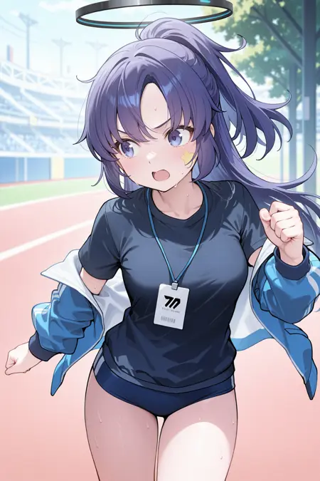 Additional prompts for the new year kimono: ponytail, sticker on face, track jacket, blue buruma, solo, t-shirt, id card, lanyard, sneakers, open clothes