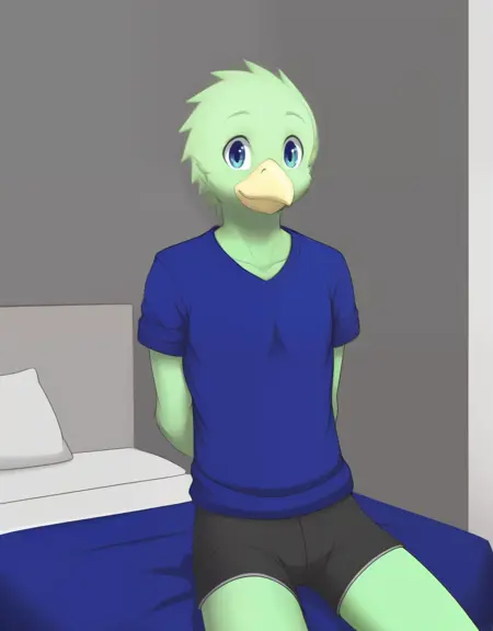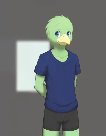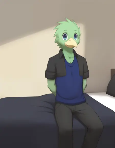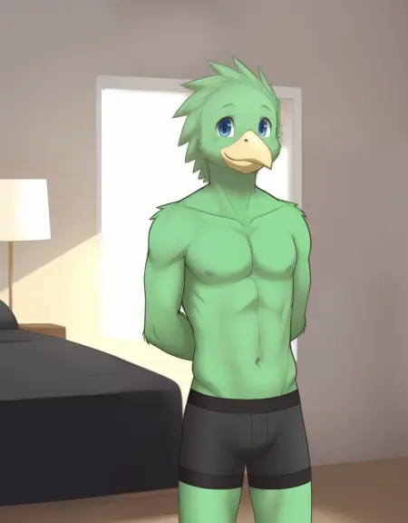 関連語:green skin, green hair, short hair, blue eyes, aqua eyes, bird boy, beak, bird tail, headband, necklace, dog tags, cropped jacket, short sleeves, sleeves rolled up, open clothes, belt, black male underwear