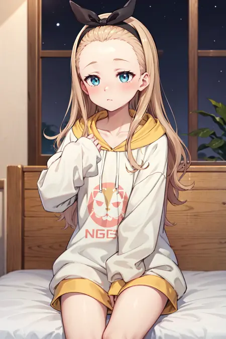 - kurumi \(lycoris recoil\),long hair,black hairband,hair ribbon,forehead,collarbone,hoodie,white hoodie,drawstring,long sleeves,sleeves past fingers,barefoot