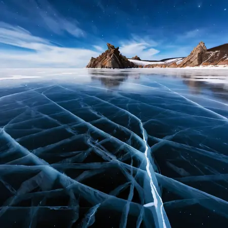 Professional photo of frozen Lake Baikal, partially cloudy, starry night, cracked ice. DSLR photo, high details, masterpiece