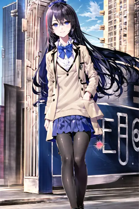 otoha hiiragi, school uniform, beige jacket, open jacket, long sleeves, blue cardigan, red bowtie, blue pleated skirt, black pantyhose, black loafers / idol, waitress, blue dress, short sleeves, waist apron, name tag, black footwear